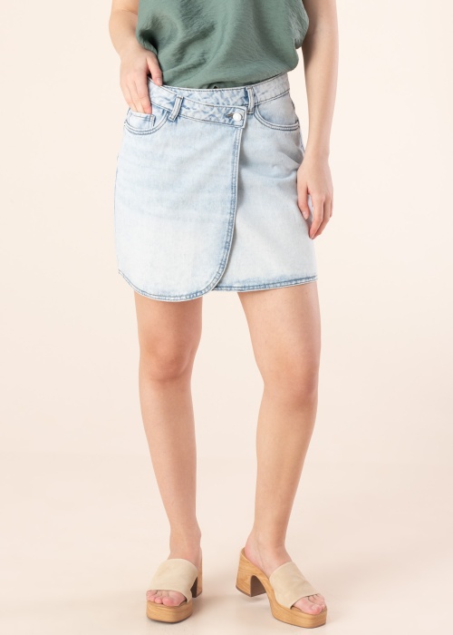 Нестареющая юбка Vero Moda подходит для летного ношения. Молодёжная и покрой с запахом юбка- из неэластичного денима и полуобтягивающий покрой. Пояс застёгивается на пуговицы , также спереди и сзади имеет открытый карман. Рост модели - 178 см и носит размер S.