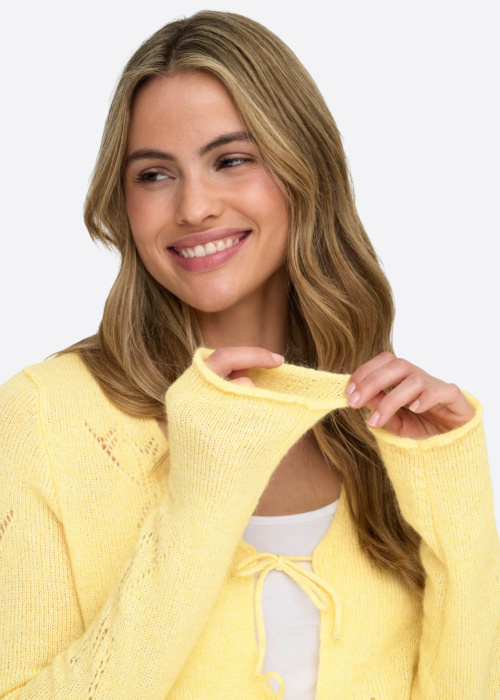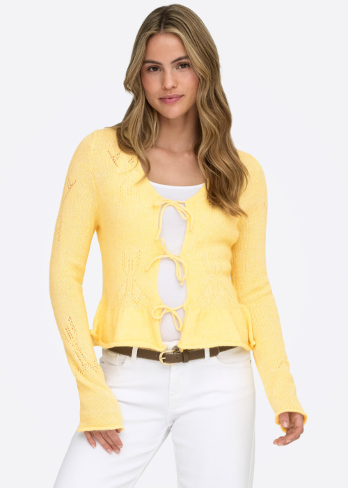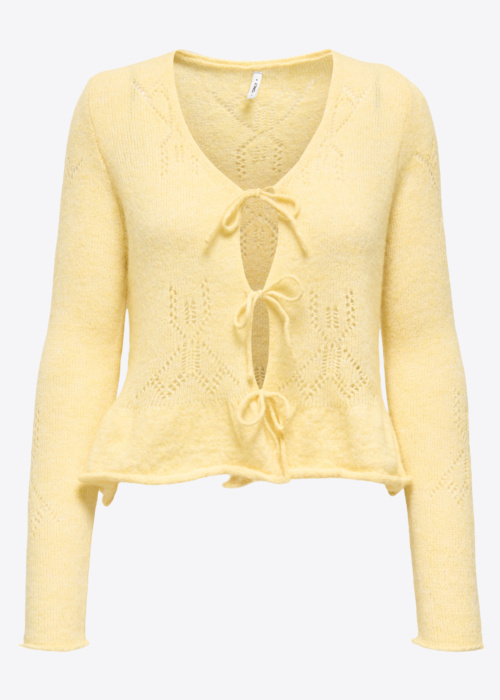 Кардиган Only Helga Life для женщин - это стильный и уютный выбор для прохладных дней. Он выполнен в привлекательном дизайне с интересным узором и вязаной текстурой. Спереди кардиган завязывается на ленту, что придаёт ему изысканность и женственность.
