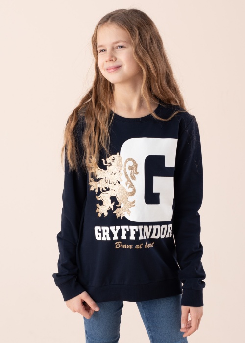 Толстовка с тематикой дизайнка Harry Pottery и Wizarding World, Name It Odille, изготовлена из удобной и мягкой ткани с органическим хлопком. На горловине, рукавах и снизу удобный соник, а перед украшен текстом „Griffindor” и блестящим логотипом. Внутри мягкая, пуховая поверхность. Рост модели - 142 см и носит размер 146/152. Материал: органический хлопок 95%, эластан 5%.