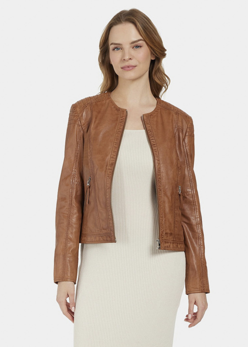Женская кожаная куртка Saki Paula отличается высоким качеством и женственным стилем. Она имеет круглый вырез и боковые карманы на молнии, что делает её практичной и удобной. Декоративная строчка на плечах придаёт куртке особый шарм и элегантность.
