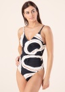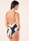 Пёстрый и обтягивающий покрой купальник- открытая спинка и быстро сохнущий . Перед украшает дизайнерский шов , внутри- снимаемая подушечка , также длина брителей регулируется. Рост модели - 176 см и носит размер 38B.