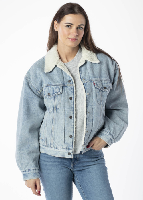 Женская куртка Levi's 90s Sherpa Trucker - это стильная и модная вещь с винтажным дизайном. Она обладает теплой, пушистой подкладкой и оснащена карманами с кнопками на груди, а также открытыми карманами спереди. Куртка застегивается на кнопки спереди. Модель имеет рост 176 см и носит размер S.