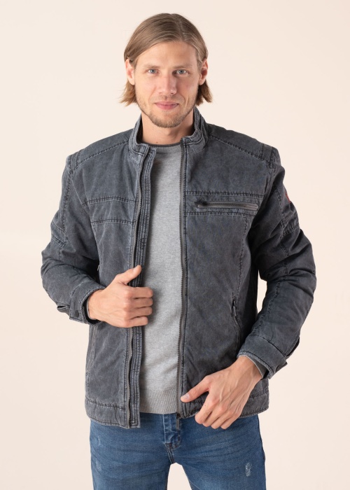 Куртка в стиле косухи от бренда Guess. Небольшой воротник-стойка. Полочки с застёжкой на молнию. На передней части изделия расположены карманы с вертикальной молнией. На груди карман на молнии. Внутри изделия расположен потайной карман на планке. Гладкая стёганая подкладка. Наполнитель из полиэстера обеспечивает тепло и при прохладной погоде. На левом рукаве расположен небольшой логотип бренда из резины. Красиво выбеленная поверхность изделия создана, благодаря уникальной окраске, придающей уникальность каждому экземпляру изделия. Рост модели 193 см. Демонстрируемое изделие размер L. Длина изделия по спинке, для данного размера, 69 см. Состав материала. Основная часть: хлопок 55%, полиамид 45%. Подкладка и наполнитель: полиэстер 100%. Цвет: серый