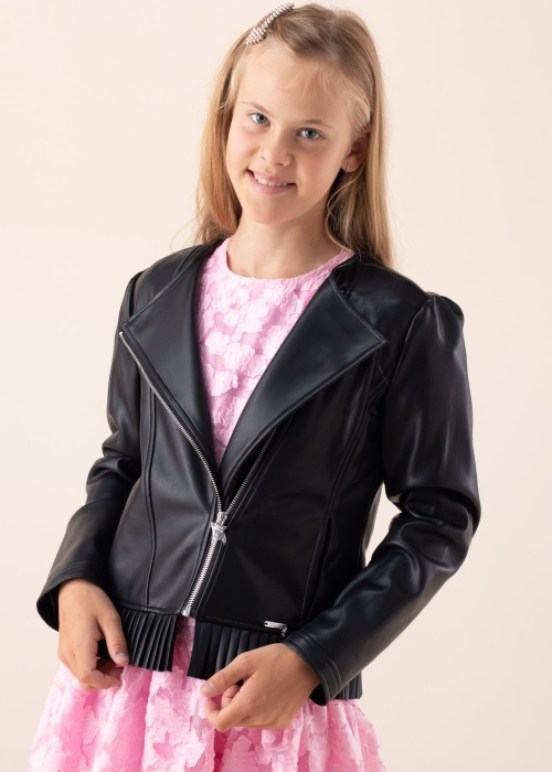 Изготовленная из изумительно мягкой искусственной кожи куртка Guess - стильная и красивая. С круглой горловиной куртку украшают декоративные швы, слегка с эффектом буф рукава и плиссированная оборка по нижнему краю. Полочки застёгиваются на диагональную молнию, по бокам - открытые карманы. Рост модели 146 см, носит размер 147. Длина изделия от ворота до нижнего края 49,5 см. Материал: полиуретан 100%. Цвет: чёрный.
