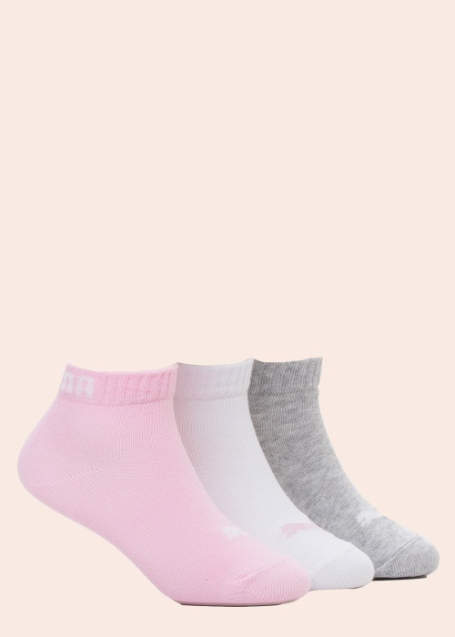 Приятные, хлопковые, низкие носки Puma. Сверху удобный соник, на котором надпись бренда, на носке логотип Puma. В упаковке 3 пары носков. Материал: хлопок 73%, полиамид 3%, полиэстер 23%, эластан 1%. Цвет: серый/белый/розовый