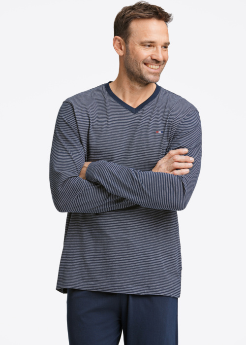 Мужская пижама Bison — это уютный и стильный выбор для комфортного отдыха. Она выполнена в полоску, имеет V-образный вырез и длинные рукава, что придаёт ей элегантный вид. Изготовленная из мягкого и эластичного материала, пижама оснащена поясом на резинке и шнурком для дополнительного удобства.