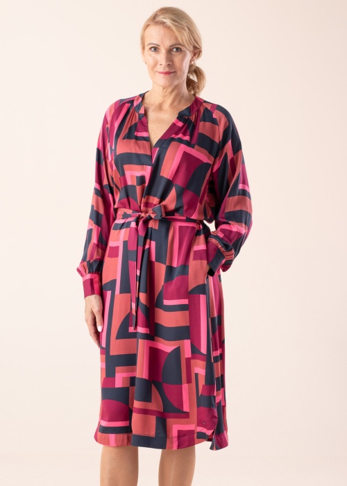 Привлекательное и женственное платье Bugatti подходит для дней разного характера. Шелковистое и хорошо обвисающее платье- длина выше колена и длина выше колена. В середине пояс на завязках, сбоку открытый карман и на концах рукавов застёжка на пуговицы. Игривый узор добавляет привлекательности. Рост модели - 178 см и носит размер 38.