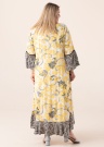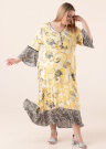 Элегантный силуэт по-настоящему летнего платья Ciso идеально подходит как для торжественных случаев, так и для повседневной носки! V-образный вырез платья из эластичной ткани застегивается на пуговицы, а воланы на рукавах и подоле придают романтическую нотку. Рукава дополнены черной деталью, которая красиво закручивается на переходе волана. Нижнее платье из вискозы под цвет кожи не позволяет одежде стать прозрачной и подчеркивает поразительное сочетание узоров. Рост модели - 167 см, носит размер 46. Общая длина платья составляет 131,5 см.