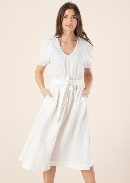 Простое льняное платье Esprit для летного ношения. Тонкое и дышащее платье- v-горловина и длина Midi. Сбоку имеет открытый карман и в середине- резинка , также пояс на завязках. Рост модели - 178 см и носит размер 36.