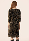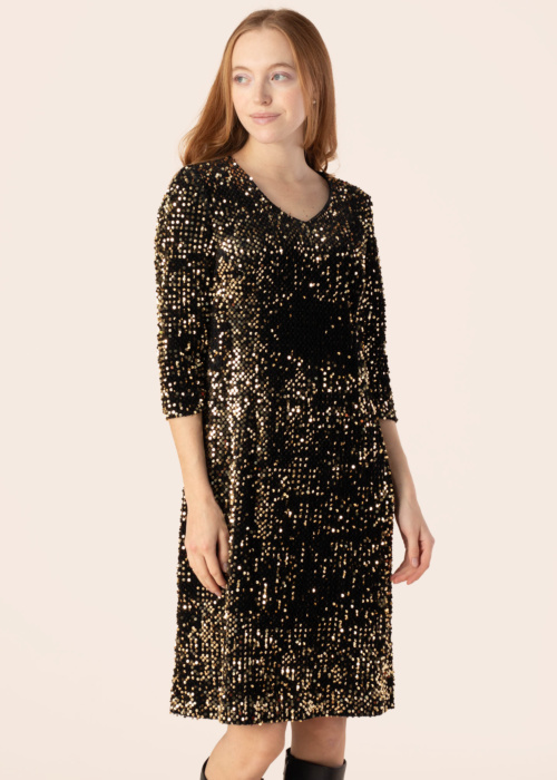 Платье Althea для женщин воплощает в себе элегантность и стиль, идеально подходящее для праздничных мероприятий. Оно изготовлено из бархатной ткани, украшенной блестящими пайетками, что придаёт ему изысканный вид. Платье имеет V-образный вырез и рукава до локтя, что делает его особенно нарядным. Модель ростом 174 см носит размер 38.