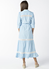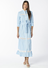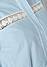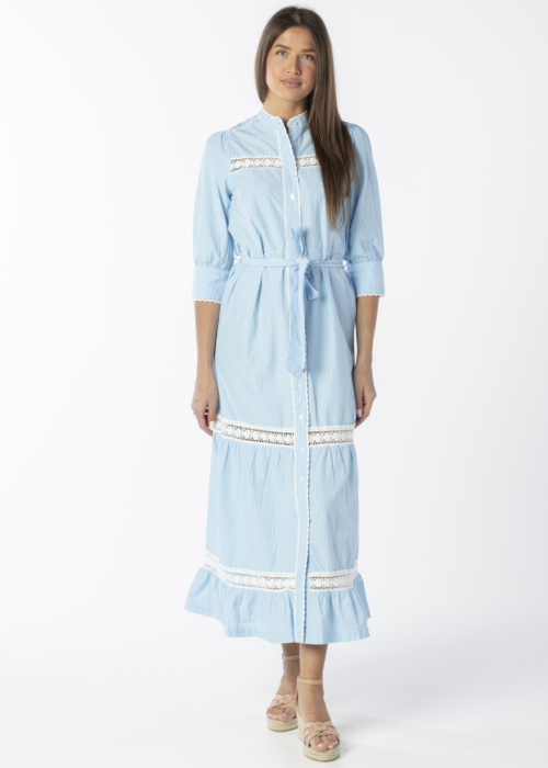 Платье Mexx для женщин обладает ретро-шармом и женственностью. Оно украшено полосатым узором и имеет рукава длиной три четверти. Платье красиво драпируется, спереди застёгивается на пуговицы и имеет привлекательную оборку по нижнему краю. Пояс, который завязывается на талии, добавляет изысканности, а кружево придаёт особый шарм. Модель имеет рост 178 см и носит размер 36.