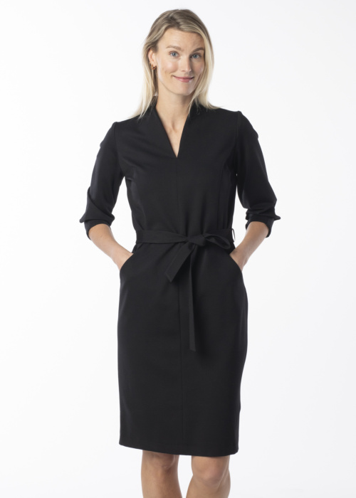 Платье от Hansmark для женщин отличается классическим и стильным дизайном с рукавами три четверти и V-образным вырезом. Оно сшито из эластичной и приятной на ощупь ткани, которая также отличается прочностью. Платье оснащено боковыми карманами и поясом, который можно завязать. Модель на фото имеет рост 177 см и носит размер 38.