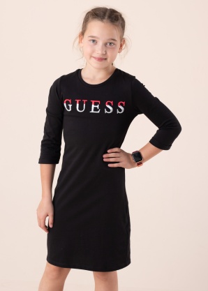 Платье для девочки Guess из приятной хлопковой ткани, идеально подходит для повседневной носки. Черное платье с рукавами длиной 3/4 и вышитым названием бренда на груди. Ткань отличается отличной эластичностью, что обеспечивает комфорт при носке. Идеально подойдет девушке, которая ценит простой стиль. Рост модели - 147 см, надет размер 140. Общая длина 75 см. Материал: органический хлопок 100%. Цвет: черный.