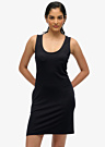 Платье SuperDry для женщин выполнено в стильном черном цвете и имеет круглый вырез. Эластичный материал и облегающий крой подчеркивают фигуру, делая его идеальным для повседневной носки. На боковой стороне расположены открытые карманы, добавляющие удобство и практичность.