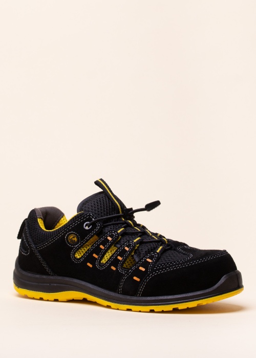 Комфортная рабочая обувь VM Footwer в Мемфисе с удобной широкой полосой и дышащим текстильным верхом комфортно легкая и качественная. При производстве обуви используется прочная замша толщиной 1,8-2,0 мм, на верхней поверхности которой фиксируются эластичные резиновые лямки с удобной стопорной застежкой. Внутри сетчатая подкладка MESH и стелька с умеренной амортизацией обладают воздухопроницаемостью, устойчивостью к истиранию и антистатичны. С усилением носа. Подошва изготовлена из прочного резинового материала и имеет нескользящий рисунок. Обувь с символом безопасности S1 ESD постоянно снижает статическое электричество. Вес обуви 39-го размера - 475 г. Цвет: черный / желтый.