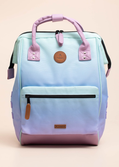 Поверхность из текстиля, а основное отделение открытывается на замок. спереди и сзади- карман с молнией атрактивности добавляют эффектные детали. Внутри карман для компьютера с защитной прокладкой. и сзади расположен элемент, с помощью которого можно прикрепить сумку к телескопической ручке чемодана Спинка и регулируемые ремни имеют мягкую обивку, добавляющую удобсва, а сверху ручка.
