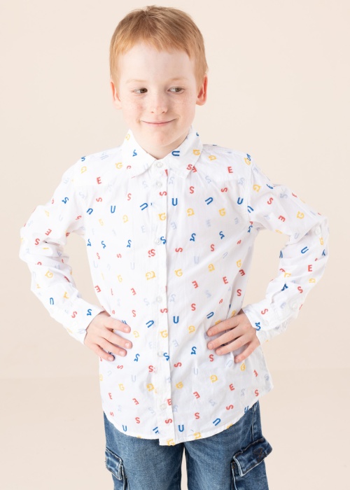 Строгая рубашка Guess отличит тебя от серой массы. Стильная рубашка- воротник с отворотом и воротник с отворотом. На передней стороне имеет застёжка на пуговицы , на рукавах пуговица , также акцента добавляет интересный дизайн. Комплименты и восторженные взгляды гарантированы! Рост модели - 120 см и носит размер 122.
