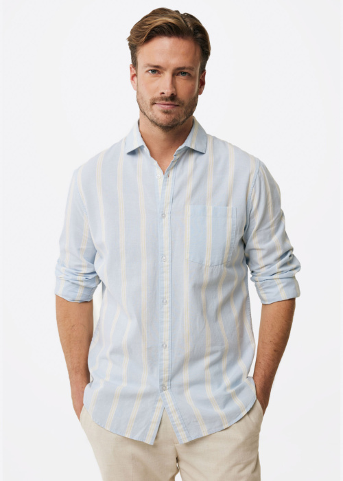 Мужская рубашка от Mexx — это удобная и классическая одежда с полосатым узором. Она имеет воротник с кантом и стандартный крой, что делает её идеальной для повседневного ношения. Рубашка застёгивается на пуговицы спереди и на манжетах, а также имеет открытый карман на груди.