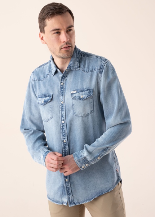 Красивая джинсовая рубашка Guess Western идеальна для стильного, уверенного мужчины, который всегда в тренде. Полочки с застёжкой на удобные кнопки. Отложной ворот. Два нагрудных кармана с клапанами. Манжеты с застёжкой на кнопки придают оригинальную форму рукавам. На груди расположен минималистический логотип бренда. Рост модели 188 см. Демонстрируемое изделие размер L. Состав материала: Tencel™ Lyocell 100%. Цвет: голубой