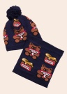 Симпатичный комплект состоит из шарфа и шапочки и станет прекрасным подарком для маленького мальчика. Мягкая вязаная шапка с помпоном декорирована узором мишек и логотипа бренда. Мягкий шарф-труба декорирован узором бочонков с мёдом, мишками и логотипом бренда. Мягкая, комфортная изнанка. Состав материала. Основная часть: вискоза 44%, полиэстер 31%, полиамид 24%, эластан 1%. Внутренняя отделка: хлопок 95%, эластан 5%. Цвет: тёмно-синий/узорчатый