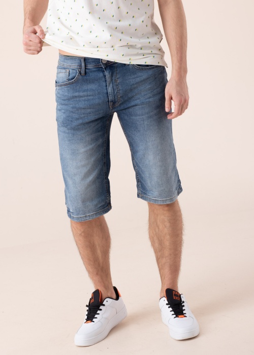 Брюки до колен от Blend идеально подходят для ношения в летний сезон! Талия со шлёвками застегивается на пуговицу и молнию. Один из трех передних карманов меньше по размеру и имеет круглый логотип бренда в левом углу. Сзади находятся два накладных кармана, над правым из которых изображена эмблема из ткани с текстом. Эффект потёртости добавляет изделию летнего настроения, эластичный джинс удобен в ношении. Рост модели 188 см, изделие в размере L.