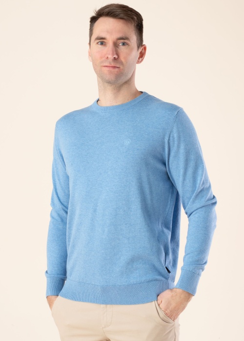 Солидный свитер Bugatti подходит для повседневного ношения дома, на работе и отдыхе. Динамичный приятно мягкий свитер- круглая горловина и тонкий покрой. На груди находится вышитый логотип , также как на краях рукавов, так и снизу соник. Удобства добавляет эластичность материала. Рост модели - 188 см и носит размер L.