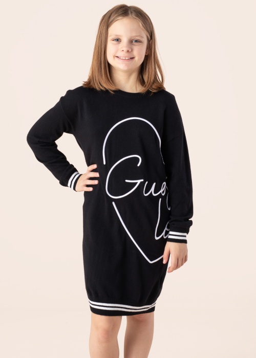 Платье-свитшот для девочек от Guess - это стильный и удобный выбор на каждый день. Модель имеет облегченную конструкцию и выполнена в миди длине. Платье связано и имеет свободный крой, что делает его идеальным для повседневной носки. Эффектный логотип бренда располагается на левой стороне, а манжеты, подол и воротник отделаны резинкой. Модель ростом 150 см носит размер 147.