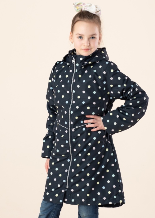 Узор в горошину весенне-осеннее пальто Name It Kids удивляет красивым внешним видом. Молодёжное лёгкое весенне-осеннее пальто- тонкое и лёгкое. Полочки застёгиваются замок, карманы свободный покрой и низ свободно свисает. Снимаемый капюшон , на концах рукавов соник и талию подчёркивает встроенная резинка на спине. Рост модели - 145 см и носит размер 152.