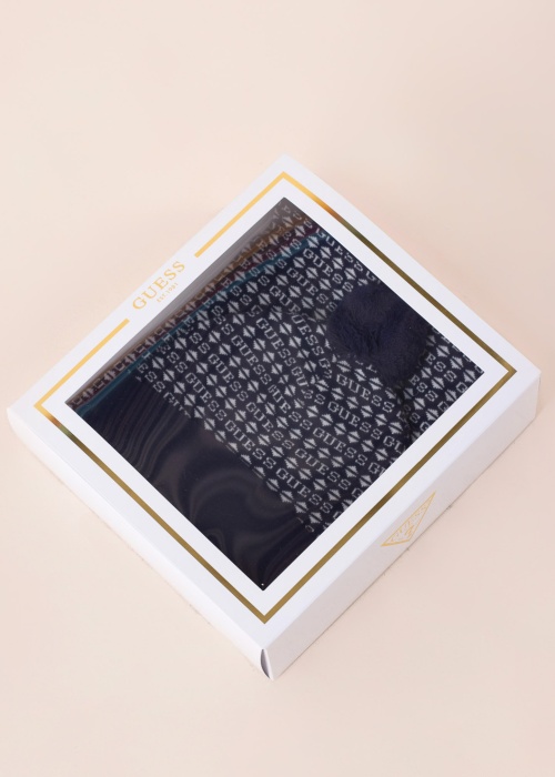Зимняя шапка Guess из двойной вязки и шарф-труба, покрытые узором из ромбов и логотипов бренда. Нижний край подвёрнут и сверху классный помпон. Внутри шарфа меховой текстиль, придающий уют и тепло.