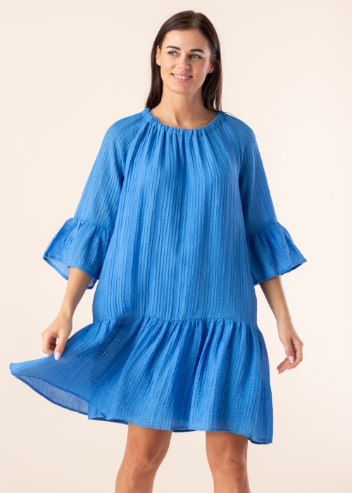 Isikupärane Soyaconcept kleit Mirana sobib suvepäevade nautimiseks. Avara istuvusega kleit on kolmveerand varrukatega, kerge ja lendlev. Turjal on seotav pael ning ilmekust lisavad veetlevad satsid varrukaotstes. Modelli pikkus on 176 cm ning kannab suurust S.