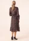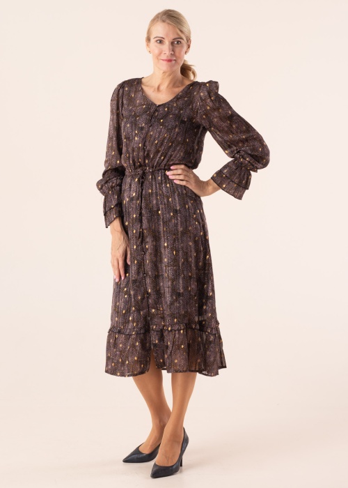 Lendlevast kangast Soyaconcept kleit Roda sobib nii peole kui kohvikusse! Kleiti katab kullasärase mustriga õhuke kangas, mis kumab läbi. Sellel on avar ümar kaelus ja nööpidega esikinnis, mis avaneb täisulatuses. Vööjoonel on tunnelpael, millega taljet rõhutada ning seelikuosa on kaunist laienev ning selle all ääres on rüüsirida, rüüsid kaunistavad ka pikkade varrukate otsi. Sisemuses on lihtne musta värvi pehmest viskooskangast aluskleit, millel on peenikesed reguleeritavad õlapaelad. Modelli pikkus on 178 cm ja kannab suurust S. Üldpikkus antud suurusnumbril on 121 cm.
