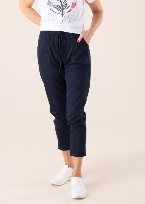 Kenad ja heledas toonis 3/4 pikkusega Soyaconcept vabaajapüksid Akila toovad sinu välimusse värskust ning huvitavat vaheldust, mida kanda läbi suveperioodi! Elastne soonikust vöökoht kinnitub reguleeritavate paeltega, boheemlaslikku välimust lisavad ümara kujuga pealeõmmeldud esitaskud ning tagumisel küljel asetsevad kaks avatud taskut. Pükste sirge lõige on keha vastas mugav ning kanga pehme elastsus liigub kehaga vabalt kaasa. Kombineeri pükse vabaajariiete või hoopis naiseliku pintsaku ning kingadega ning ole valmis kõrvalseisjate komplimentide tulvaks! Modelli pikkus on 178 cm ja kannab suurust S.