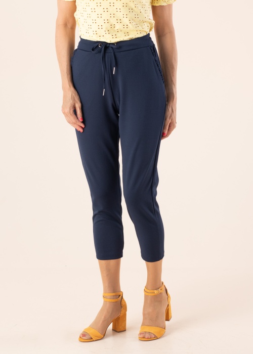 Nooruslikud Soyaconcept püksid Siham sobivad stiiliteadlikule naisele. Mõnusad püksid on 7/8 säärepikkusega ja elastse kummivärvliga. Külgedel on avatud taskud , värvlil on tunnelpael ning kandmismugavust pakub materjali elastsus. Modelli pikkus on 178 cm ning kannab suurust S.