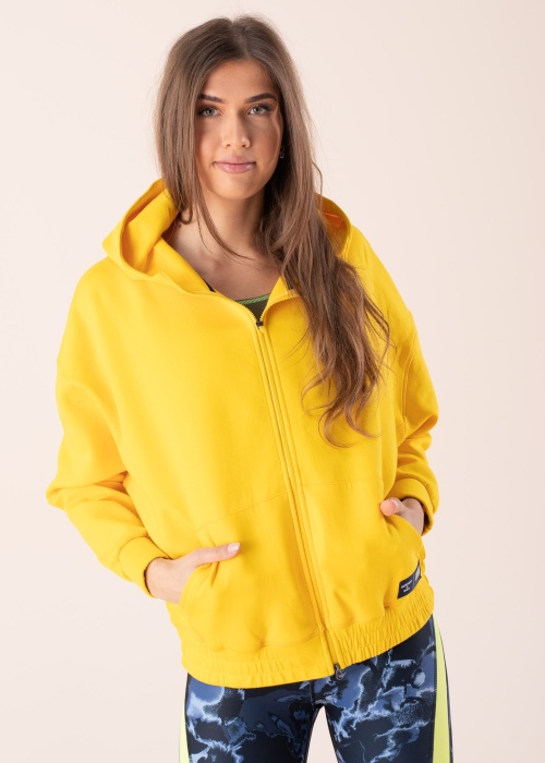 Rõõmus päiksekollane SuperDry dressipluus on trapetsikujulise lõikega, kus ees on käepärane lukk ja peale pakub vajadusel kaitset hubane kapuuts. Külgedel on koahekordsed taskud, milledest avatud taskud on pealeõmmeldud ja nende sisemuses on omakorda lukuga tasku. Varrukaotstes kui ka all servas on mugav lai kumm, mis ei veni välja ja hoiab tihedalt kehaligi. Modelli pikkus on 178 cm ja kannab suurust S.