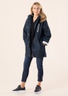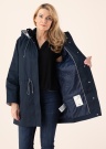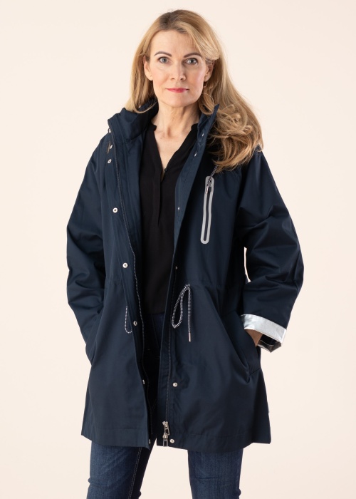 Pikk ja mugav Tom Tailor kevad-sügis mantel kannab endas merestiili, olles tänu hõbedastele detailidele efektselt kahetooniline. Eest suletav kahesuunalise traktorlukuga, mida kaitseb trukkidega katteliist. Avara lõikega varrukad on vabalt langevad ja tagasikeeratud osa on pilkupüüdva hõbedase viimistlusega. Samas stiilis voodriga kapuuts on soovi korral eemaldatav trukkidega ja eest nööridega reguleeritav. Naiselikumat taljesse hoidvat siluetti võimaldab mantlile anda keskkohas paiknevad paelad ja praktilised taskud välispinnal võimaldavad mahutada käepäraselt võtmeid kui ka telefoni. Sisemuses sile polüestervooder ja mugav riputussang. Modelli pikkus 1782 cm, kannab suurust S. Pikkus turjast alumise ääreni 85,5 cm