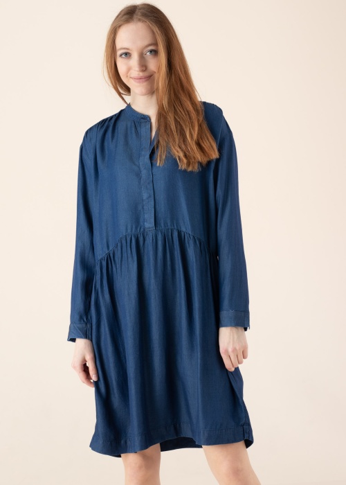 Kena Tom Tailor kleit sobib igapäevaseks kandmiseks kodus, tööl kui ka puhkehetkel. Avara istuvusega kleit on nooruslik, kerge ja kaasaliikuv. Kaelusel on nööpkinnitus ja varrukaotstes lõhikud. Toode kuulub Be Part kollektsiooni, olles loodud jätkusuutlikest materjalidest. Modelli pikkus on 174 cm ning kannab suurust 36.