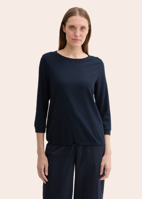 Tom Tailor naiste pluus on atraktiivne ja sobib suurepäraselt argiseks kandmiseks. Pluusil on küünarnukini ulatuvad varrukad, ümar kaelus ning õla kohal asuvad nööbid, lisaks on allosas seotav pael, mis lisab stiilset aktsenti. See ühevärviline toode kuulub Be Part kollektsiooni, olles valmistatud jätkusuutlikest materjalidest.