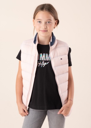 Lihtne ning mugav Tommy Hilfiger vest on ideaalne ettearvamatutel sügis- ja kevadilmadel kandmiseks. Eest on vest suletav tõmblukuga, mille lõpuni tõmbamisel moodustuv kõrgem, püstine krae pakub lisaks kaela soojashoidmisele ka efektsust, omades tagaküljel tikitud brändi kirjet. Rinnal asetseb minimalistlik lipulogo. Käeavasid ning vesti alaserva palistab elastne kummikant, andes vestile kuju. Külgedel asetsevad trukiga taskud on ideaalsed käte soojas hoidmiseks või oluliste esemete hoiustamiseks. Sisemust vooderdab libe polüamiidkangas ja sulgedest vooderdus hoiab kandja mõnusalt soojas ega lase külmal põue tungida. Modelli pikkus on 147 cm ning kannab suurust 140. Üldpikkus turjast alaservani on antud suurusel 49 cm.
