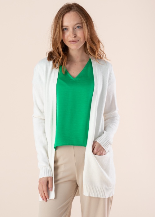 Pikema tegumoega Vila kardigan Ril sobib igapäevaseks kandmiseks kodus, tööl kui ka puhkehetkel. Mõnus ja argine kardigan on pehme ning elastne. Eest on kinnituse vaba , mugavust lisavad avatud taskud esiküljel ja varrukaotstes on soonikud. Modelli pikkus on 174 cm ning kannab suurust S.
