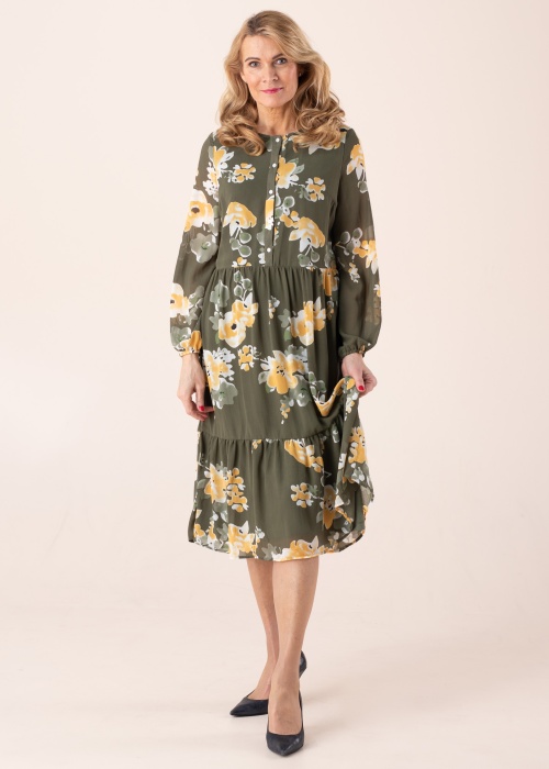 Kena ja mustriline, nööpidega Vila kleit Adeline on ideaalne igapäevaseks kandmiseks ning kombineerimiseks nii kingade kui ka tenniste või saabastega. Voodriga kleit on mugava avara lõikega ja seelikueelikuosa on vabalt langeva tegumoega ning õhem, pehme kangas pakub suurepärast liikumismugavust. Läbikumavad varrukad on mõnusalt mahulised ja otstest elastsete kummidega, mis hoiavad kenasti ümber kandja randme. Modelli pikkus on 178 cm ning kannab suurust 36. Üldpikkus on antud suurusel 112 cm. Materjal: polüester 100%.