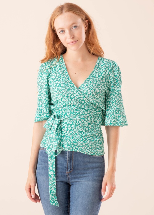 Efektne Vila pluus Caia sobib suvepäevade nautimiseks. Hõlmik lõikega pluus on taljesse hoidev ja küünarnukini ulatuvate varrukatega. Silmailu lisab mänglev muster ning keskkohas on seotav vöö. Modelli pikkus on 174 cm ning kannab suurust S.