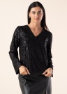 Efektne Vila pluus Glitas sobib õhtusteks kohtumisteks. See hästi langev pidulik pluus on v-kaelusega ja pikkade varrukatega ning pilku püüavad läikivad litrid pealispinnal. Modelli pikkus on 176 cm ning kannab suurust S.