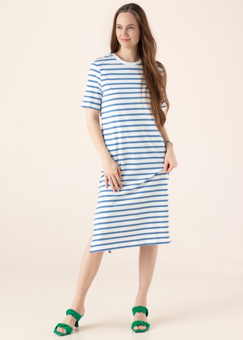 Mugav Vila särkkleit Freja sobib suviseks kandmiseks. Ajatu triibulise mustriga särkkleit on pehmest puuvillast ning sirge tegumoega. Paremal küljel on lõhik ja kandmismugavust pakub materjali elastsus. Modelli pikkus on 175 cm ning kannab suurust S.