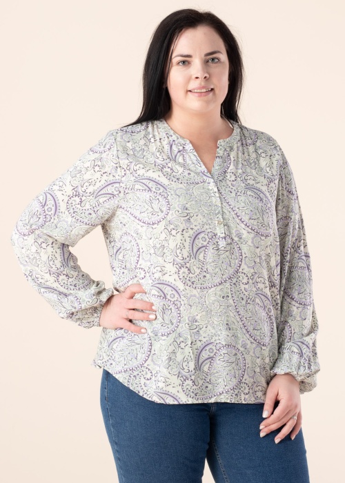 Mõnus Wasabiconcept pluus Etty mõjub värskelt ja maitsekalt. Armas mugav pluus on õhuke ning kerge. Pilku püüab põnev muster pealispinnal , varrukaotstes on kummid ja kaelusel on nööpkinnitus. Valmistatud LENZING ™ ECOVERO ™ kiust, mis on saadud sertifitseeritud taastuvatest puiduallikatest, kasutades keskkonnasõbralikku tootmisprotsessi ja järgides kõrgeid keskkonnastandardeid. Modelli pikkus on 175 cm ning kannab suurust 46-48.